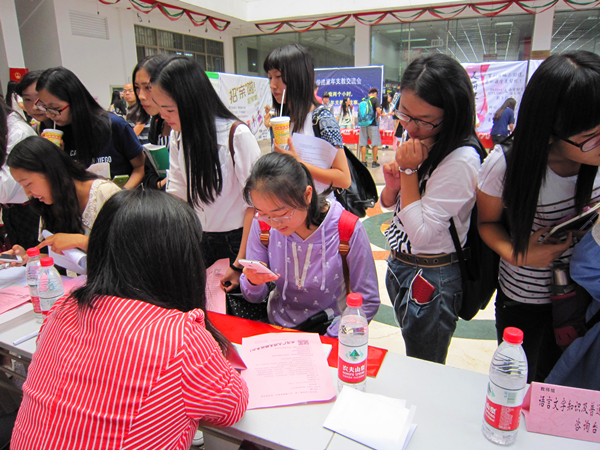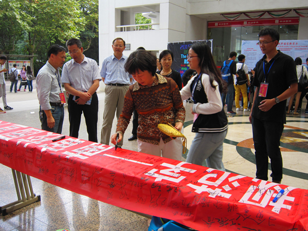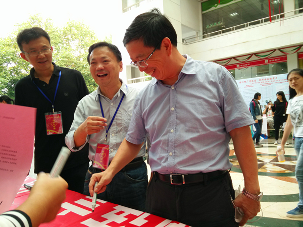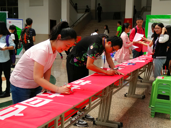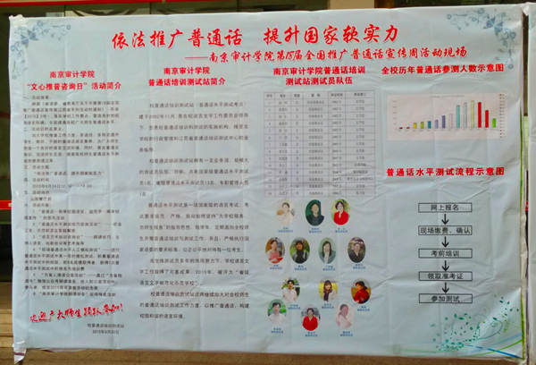 在活动现场,校领导王会金、时现、裴育副校长及教务委员会程乃胜主任、鲁靖副主任,详细地了解着活动内容,并再三叮嘱学校语言文字及推普工作的重要性,他们此次推普宣传周活动表示高度赞扬和大力支持。同时,领导们也积极地走到“普通话—南审校园语言,规范字—南审校园宣传”横幅签名处,和在场的广大师生一样,坚定地签上自己的名字。签名处留下上百人的姓名笔迹,都表明签名者今后在校园里学习普通话、推广普通话的信心和恒心;在为“盲人诵读公益活动录制台”附件,竟然排起了长队,大学生们纷纷拿出手机,扫描“为盲胞读书”公众号二维码,在测试员老师的指导下,录制有声音频向盲人朋友传递爱心;更多对普通话水平测试感兴趣的同学,涌向现场的测试员老师,纷纷请教普通话的相关知识及测试中的技巧,并现场参加普通话水平模拟测试。语言艺术咨询台及校朗诵协筹备会报名处,也吸引了众多热爱语言艺术的大学生们,他们不由地表达了期望学校提供学习语言艺术及锻炼平台的愿望。活动现场的宣传展板,更是详细地向广大师生介绍了学校对教职工、大学生普通话的要求及学分上的奖励细则,让更多的师生认识到普通话是提高自身素质的重要途径。