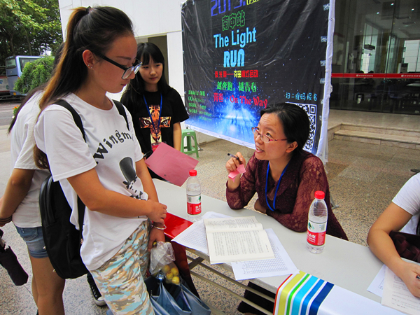 推普活动现场,为盲人诵读公益活动录制台、语言艺术咨询台、语言文字知识咨询台、普通话水平模拟测试台、南京审计学院朗诵协会报名处及横幅签名工作台,可谓是形式多彩、气氛热烈,吸引着大量前来报名、咨询、诵读的大学生们。现场13名测试员放弃休息时间,热情、耐心、细致地为每一位参与活动师生答疑,充分体现了我校测试员队伍凝心聚力、敬业奉献的团体品质。