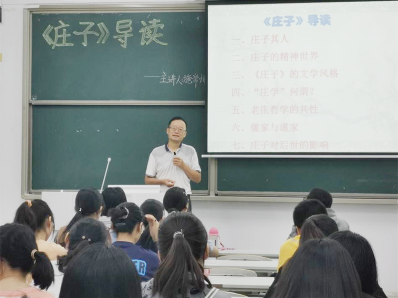 最后,施常州解释了庄子“出世”的原因——对当时战乱频仍等社会现实的不满和决绝的人生态度,并冀望同学们学习庄子清洁的精神、保持高洁的品行,发扬庄子超脱的精神境界,努力奉献社会。讲座结束后,同学们纷纷发表了自己的见解和感受,表示对庄周的道家哲学有了更深的认识,收获颇多。