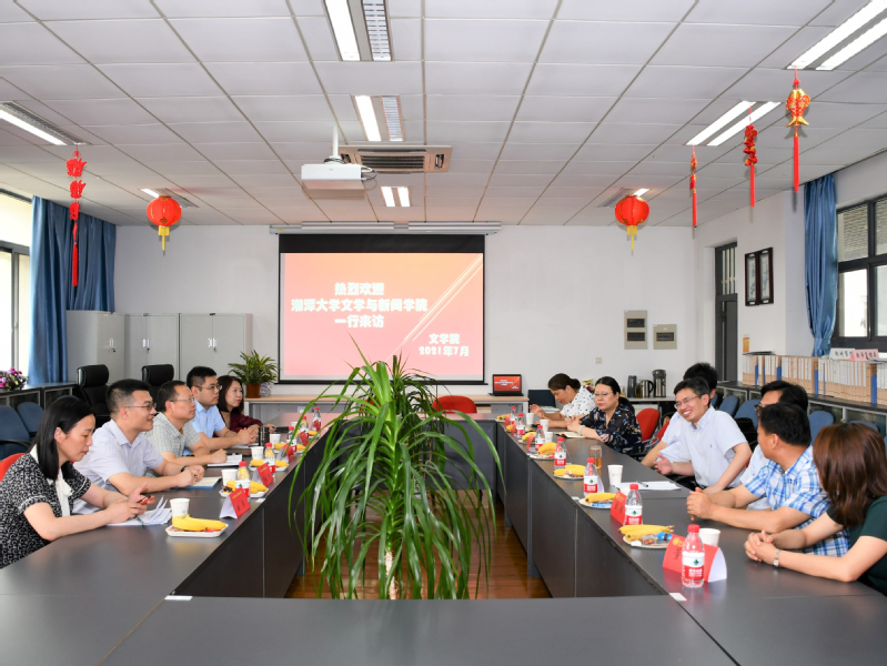 7月7号下午,湘潭大学文学与新闻学院雷磊院长、资义平书记、宋德发副院长、刘晓丽副院长和田华副院长等人应邀来福利吧 进行学科调研与交流活动。此次活动由福利吧 副院长朱军教授主持,福利吧 刘顺教授、王军书记、洪涛副院长、龚玉兰副院长等人参加。