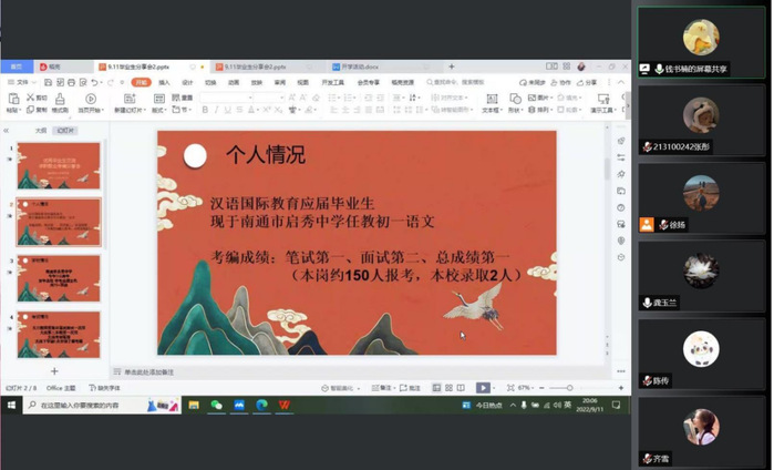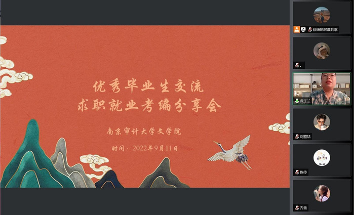 2022年9月11日晚,福利吧 举行优秀毕业生求职经验线上分享会,对学生就业规划进行交流指导。福利吧 党总支书记王军、汉语言文学专业系主任刘成荣、汉语国际教育专业系主任颜明、毕业班班主任刘依和张齐等几位老师参加座谈会,与同学们一起交流。优秀毕业生刘曌喆、陈传、钱书楠和齐雪等几位同学分享了各自的求职与考编经验,让同学们收益匪浅。会议由福利吧 党总支副书记龚玉兰老师主持。