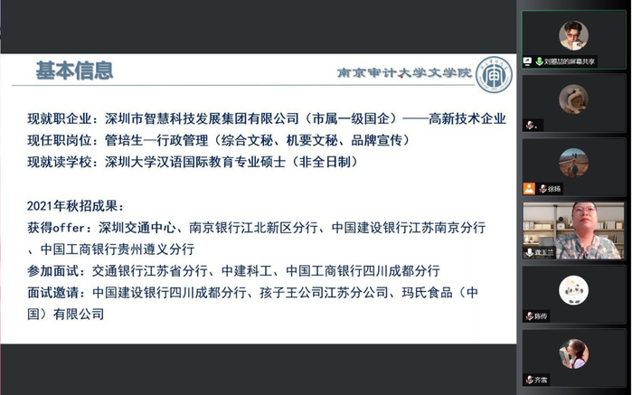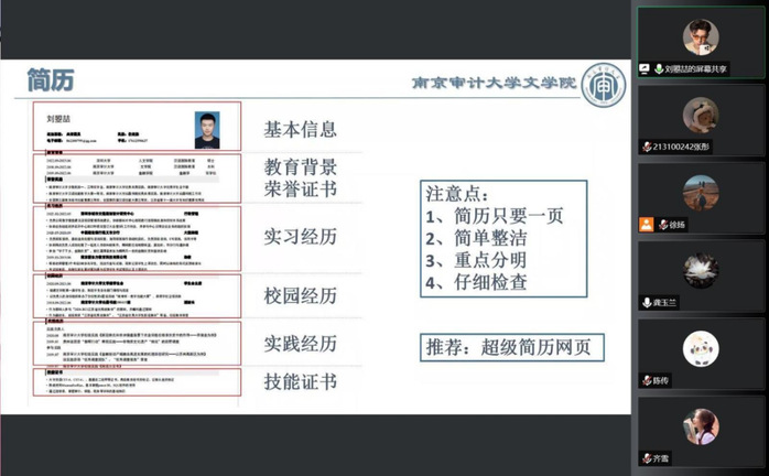刘瞾喆围绕对招聘信息的收集了解、简历撰写和面试等部分进行交流分享,给面临就业选择的同学提供了清晰的思路。